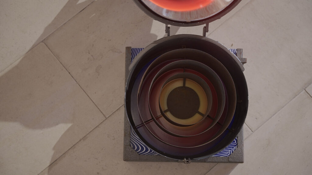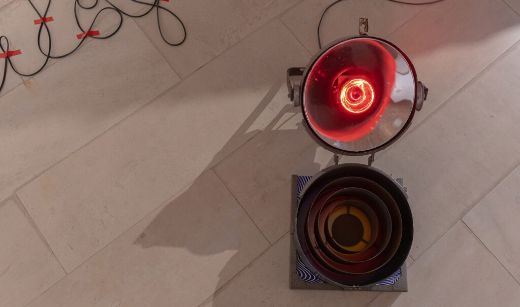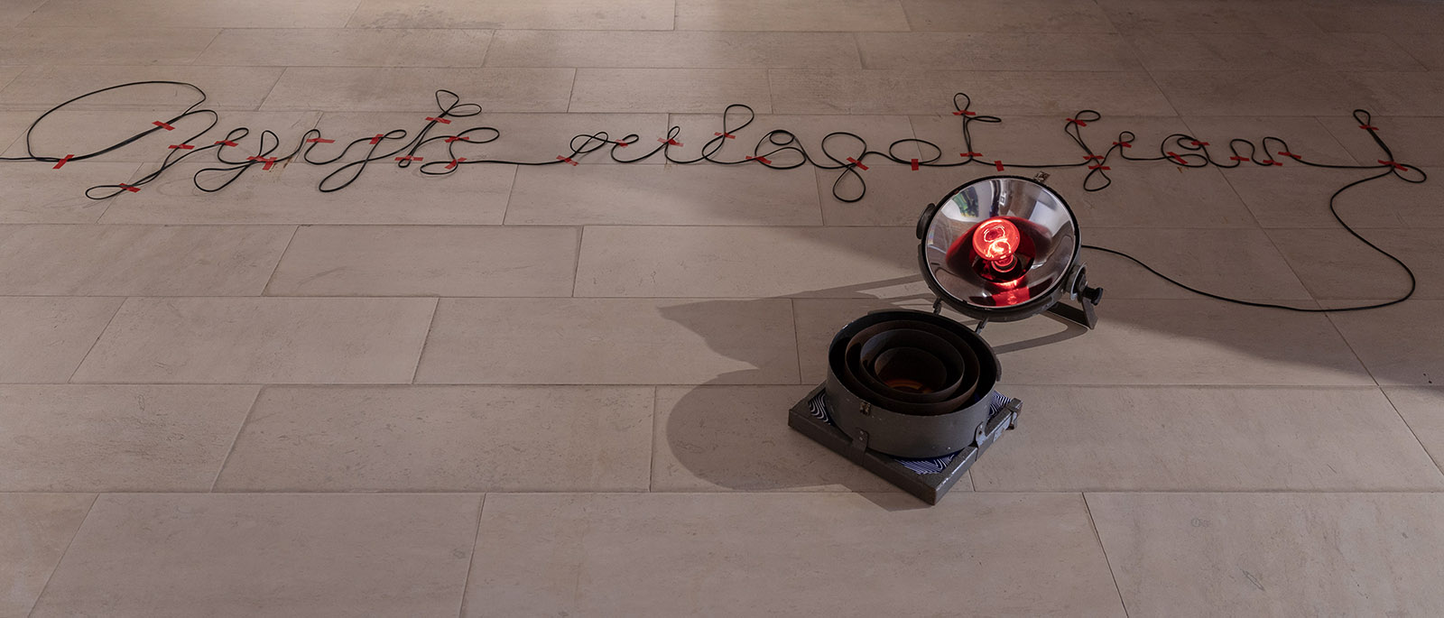 ready made + (old theatre light, IR light bulb, black wire, red tape, print) 2026