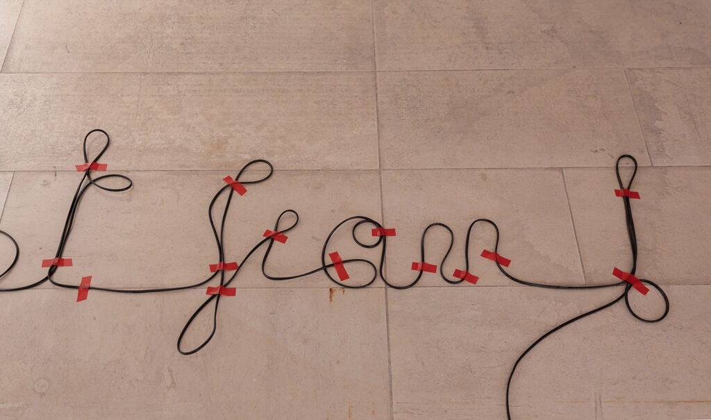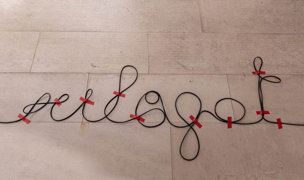 The phrase written in the thread Gyújts világot, fiam! (spoken by the film director Béla Tarr at the end of an interview) is an exhortation addressed to the next generation, with a dual and contradictory meaning: on the one hand, to kindle the light of change toward a more conscious, responsible, and equitable world; and on the other, to set the world on fire.